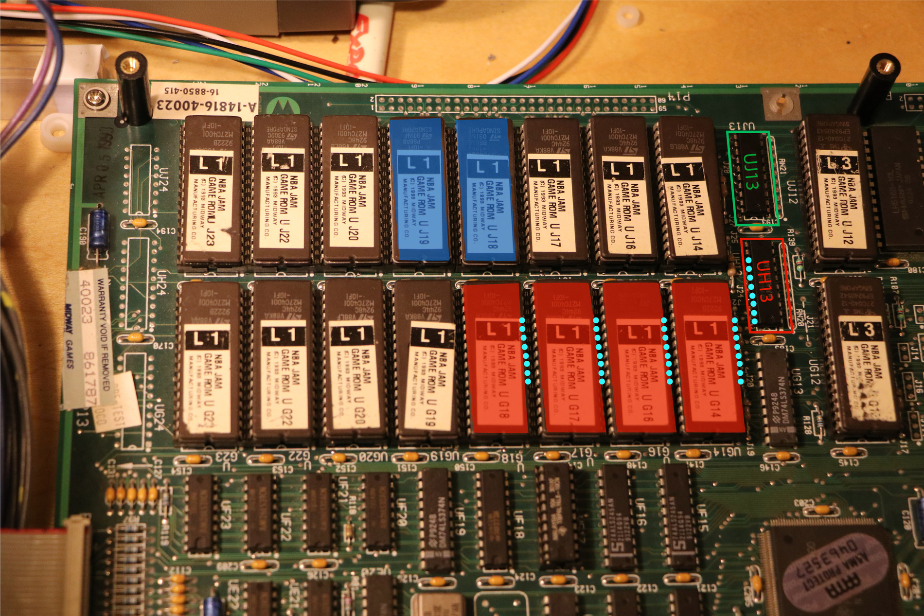 I’ve had this NBA Jam PCB for years, and recently pulled it out of storage. I was getting multiple BAD ROM errors on the startup check screen, and the games graphics were distorted and missing.